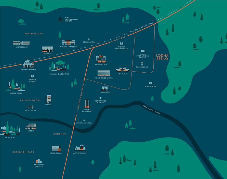 The Pune neighbourhood of Lodha CountrySide Hadapsar features both established homes and businesses. Close by prominent neighbourhoods are Koregaon Park, Sangamvadi, Kalyani Nagar, Wadgaon Sheri, and Camp.